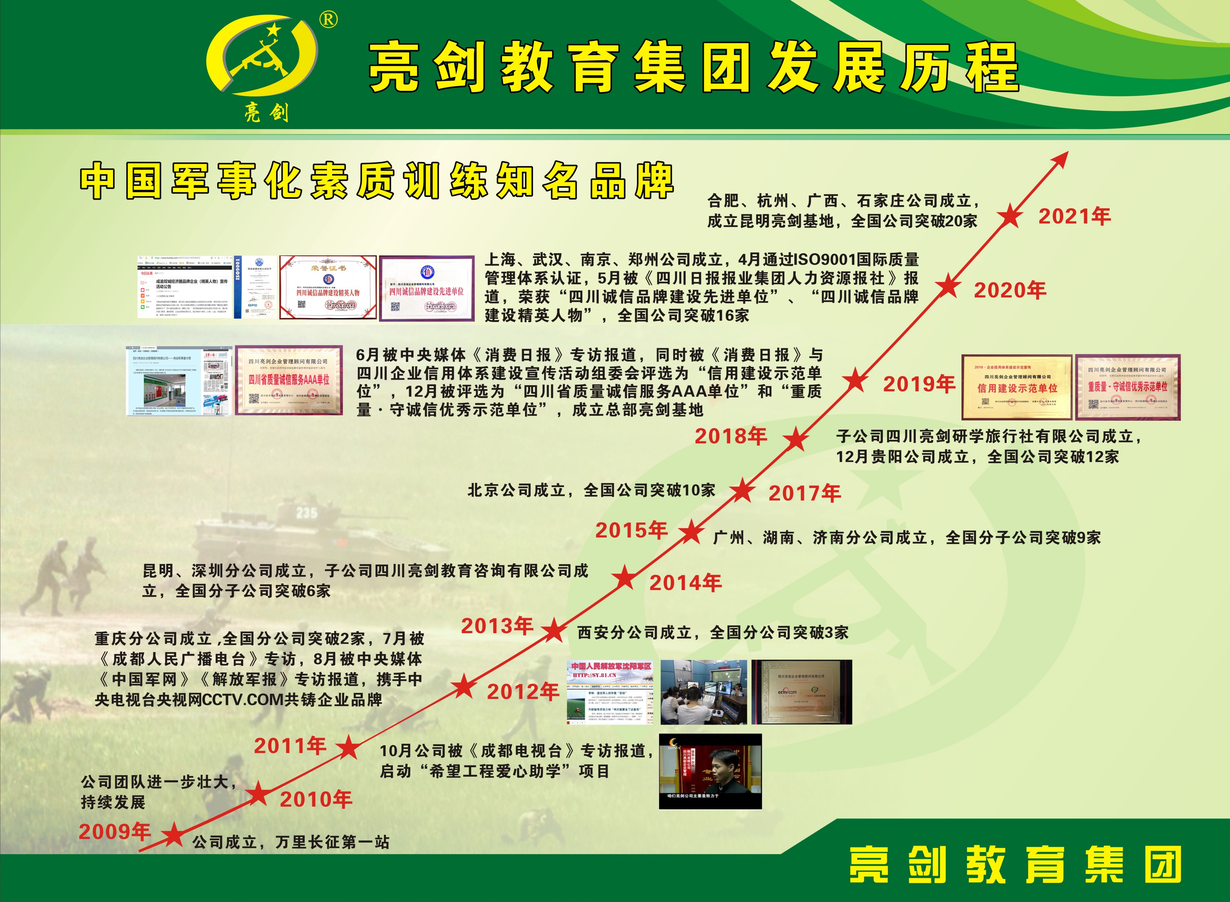 四川亮剑企业管理顾问有限公司专注于中国研学旅行产业,为中国青少年提供优质的军事化素质训练,为中小学生提供优质的研学旅行服务,为中国企业提供优质、高效的培训咨询产品,以军事化培训为特色,获得市场和客户的高度青睐!
