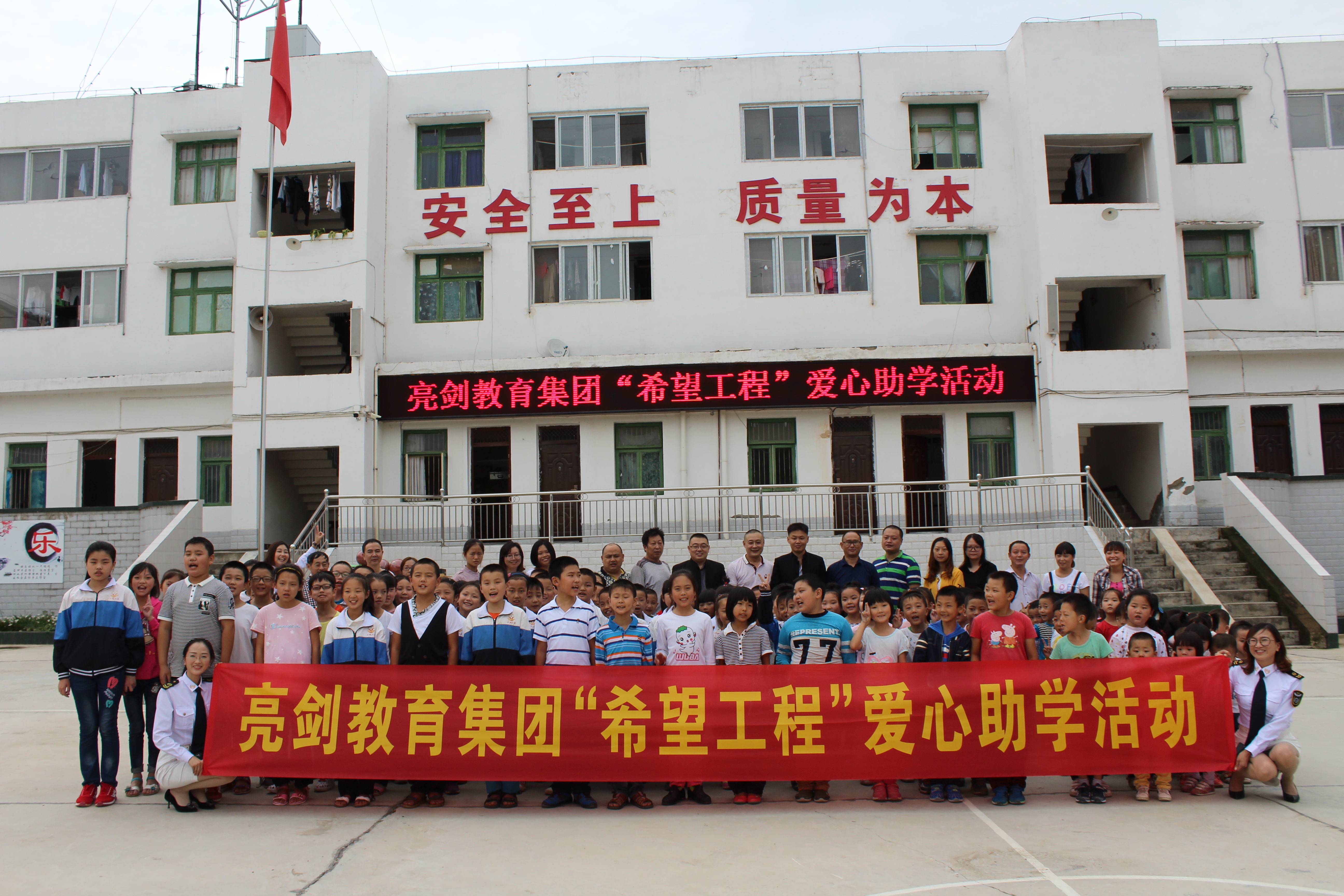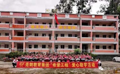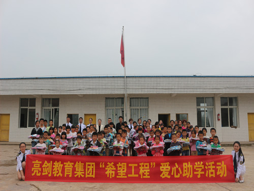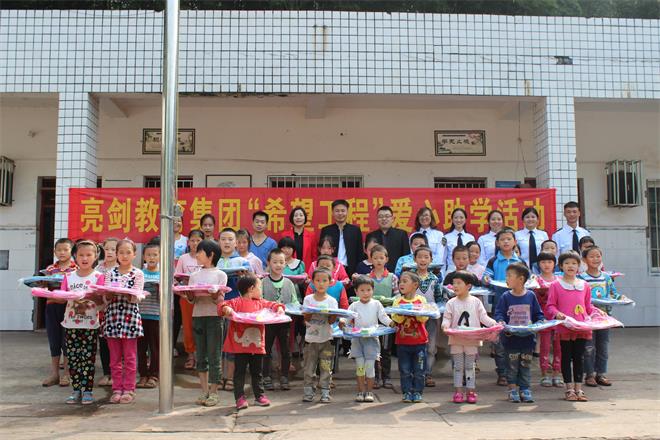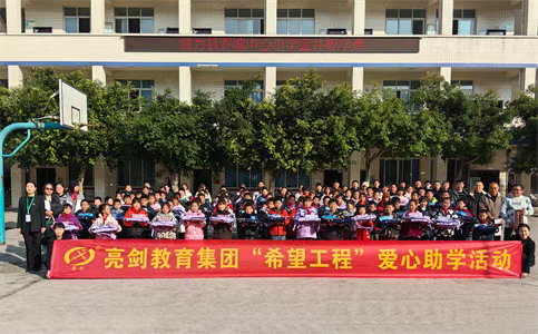 公司用亮剑精神服务于客户,用亮剑精神激励每一名员工,以爱心做事业,以感恩的心做人,于2010年支助广安华蓥市回龙镇村小学,于2011年支助夹江县龙坨小学,于2012年9月支助被央视报道的南充市升钟湖龙马镇村小学,于2013年支助雅安地震灾区蒙泉小学,2014年支助射洪县崇堂小学,2015年支助宜宾江安县长沙小学,2016年支助泸州市尧坝镇小学,2017年支助绵阳市小垭小学,2018年支助巴中市红军希望小学。2019年亮剑教育集团甘孜兴隆镇沈村小学助学行动。2020年亮剑教育集团贵州毕节市大石希望小学助学行动。2021年亮剑教育集团广西桂林市龙脊镇大寨小学助学行动。2023年支助云南省禄丰市广通镇八屯村明德小学。2024年资助乐山市犍为罗城中心小学金井教学点。