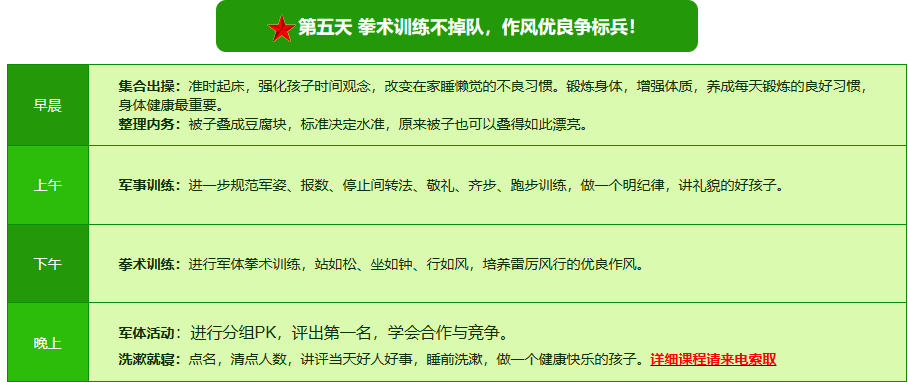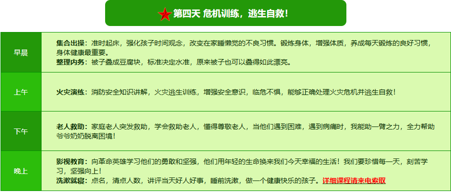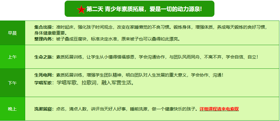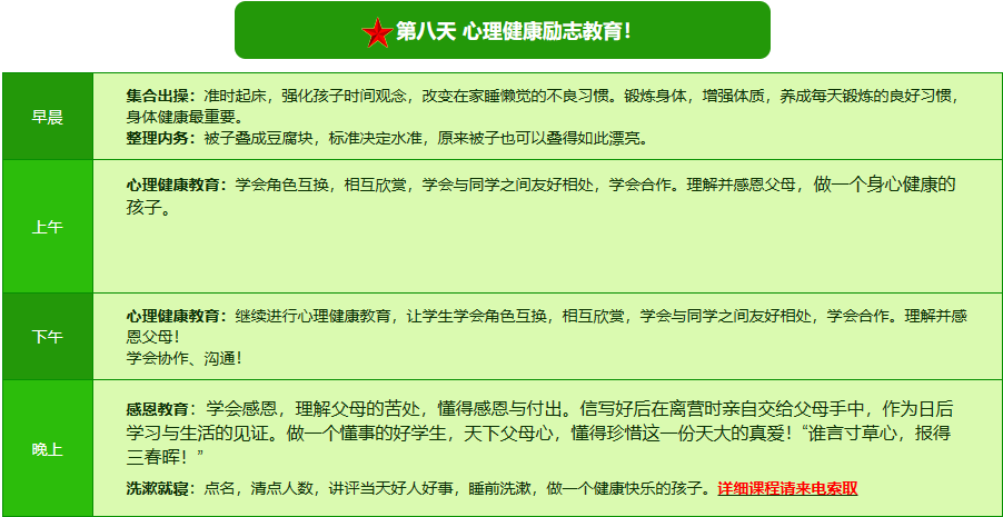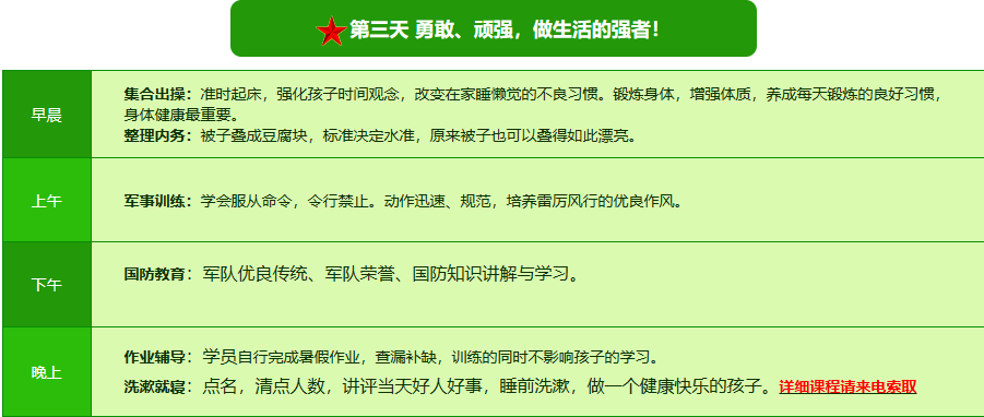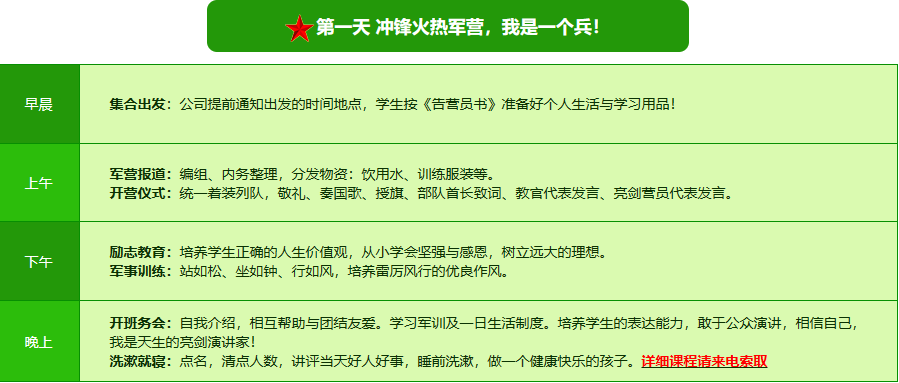 先进的特训理念:激发孩子改变和成长的核心问题是帮助孩子树立正确的人生观,价值观和学习观:让孩子明白真正学习目的,人生责任和追求目标、启发感恩之心,明白爱的真谛:树立积极心态和自信,创造自己生命的辉煌。