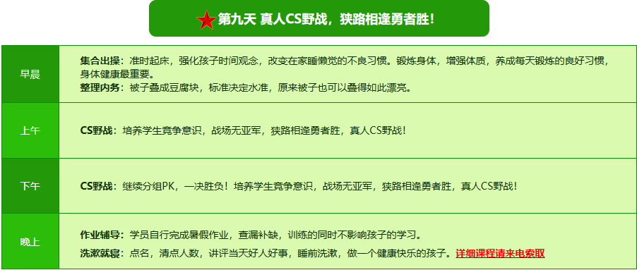 让孩子投身于一流军事环境之下,在火热军营中得到熔炼,培养吃苦耐劳、艰苦奋斗、积极向上的优良品质!为往后的人生征途打下坚实的基础,宝贵的精神财富,会使孩子受益终生!“不抛弃、不放弃!”将成为孩子对待生活、学习与追求理想的坚定信念。为此,亮剑军事夏令营将军事训练、励志教育、青少年素质拓展训练、作业辅导、心理健康教育、真人CS训练等融为一体,以实践体验激发学生潜能,启发引导学生学会生存、学会劳动、学会求知、学会吃苦、学会团结、学会创造、学会做人。