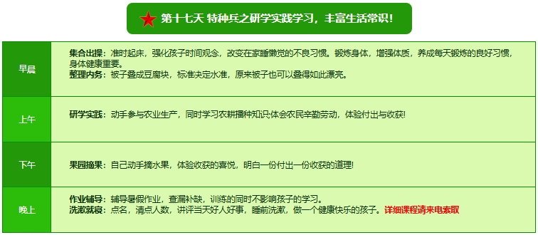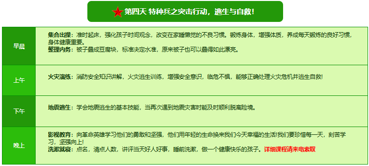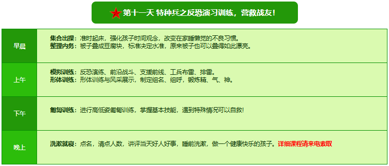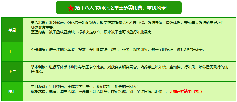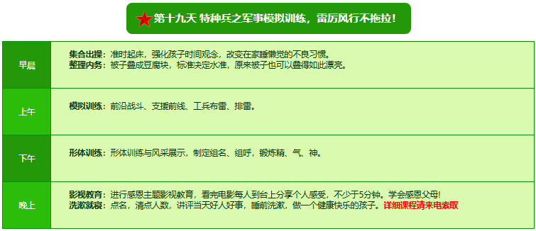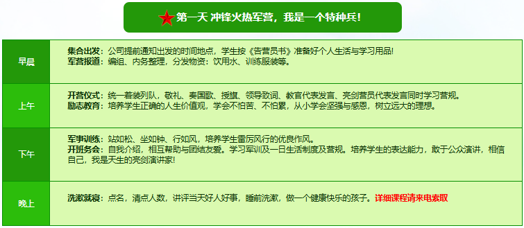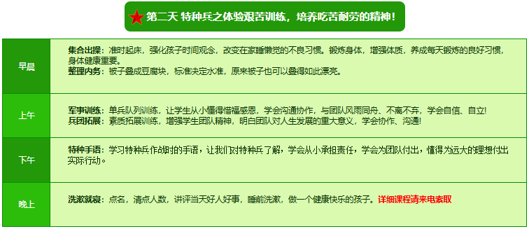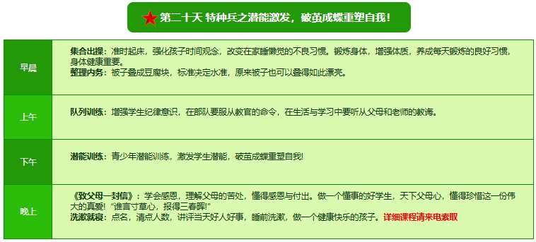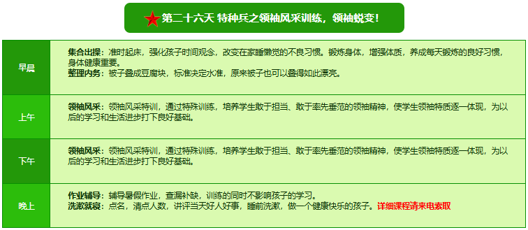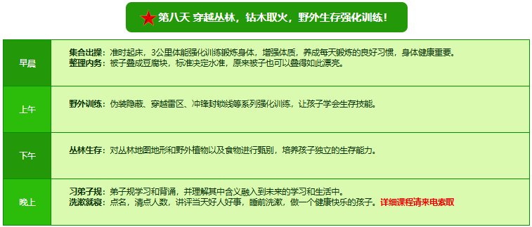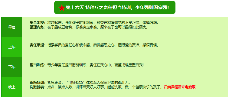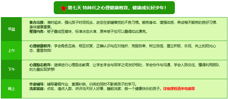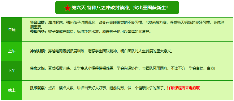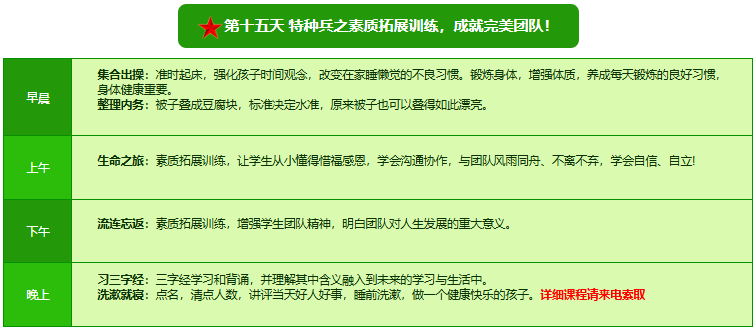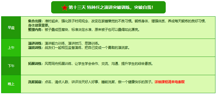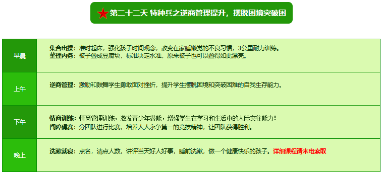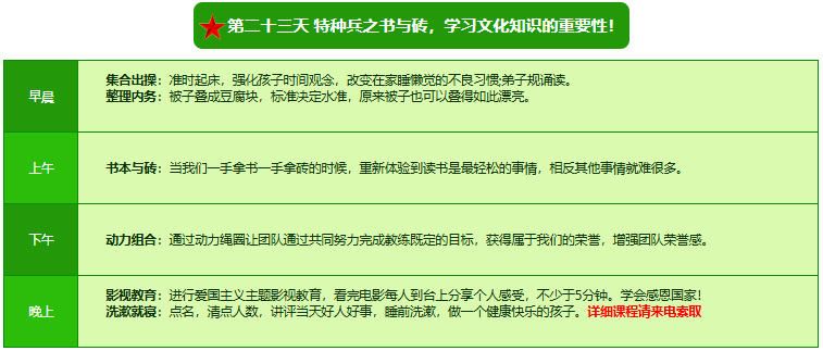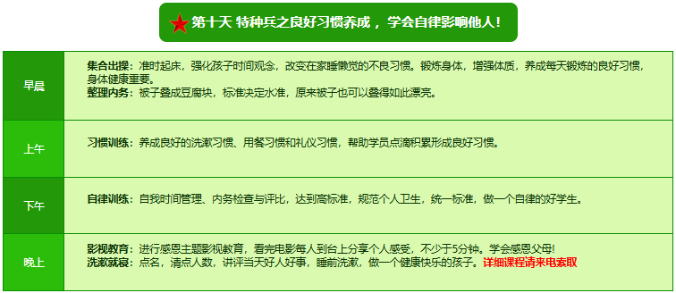先进的特训理念:激发孩子改变和成长的核心问题是帮助孩子树立正确的人生观,价值观和学习观:让孩子明白真正学习目的,人生责任和追求目标、启发感恩之心,明白爱的真谛:树立积极心态和自信,创造自己生命的辉煌。